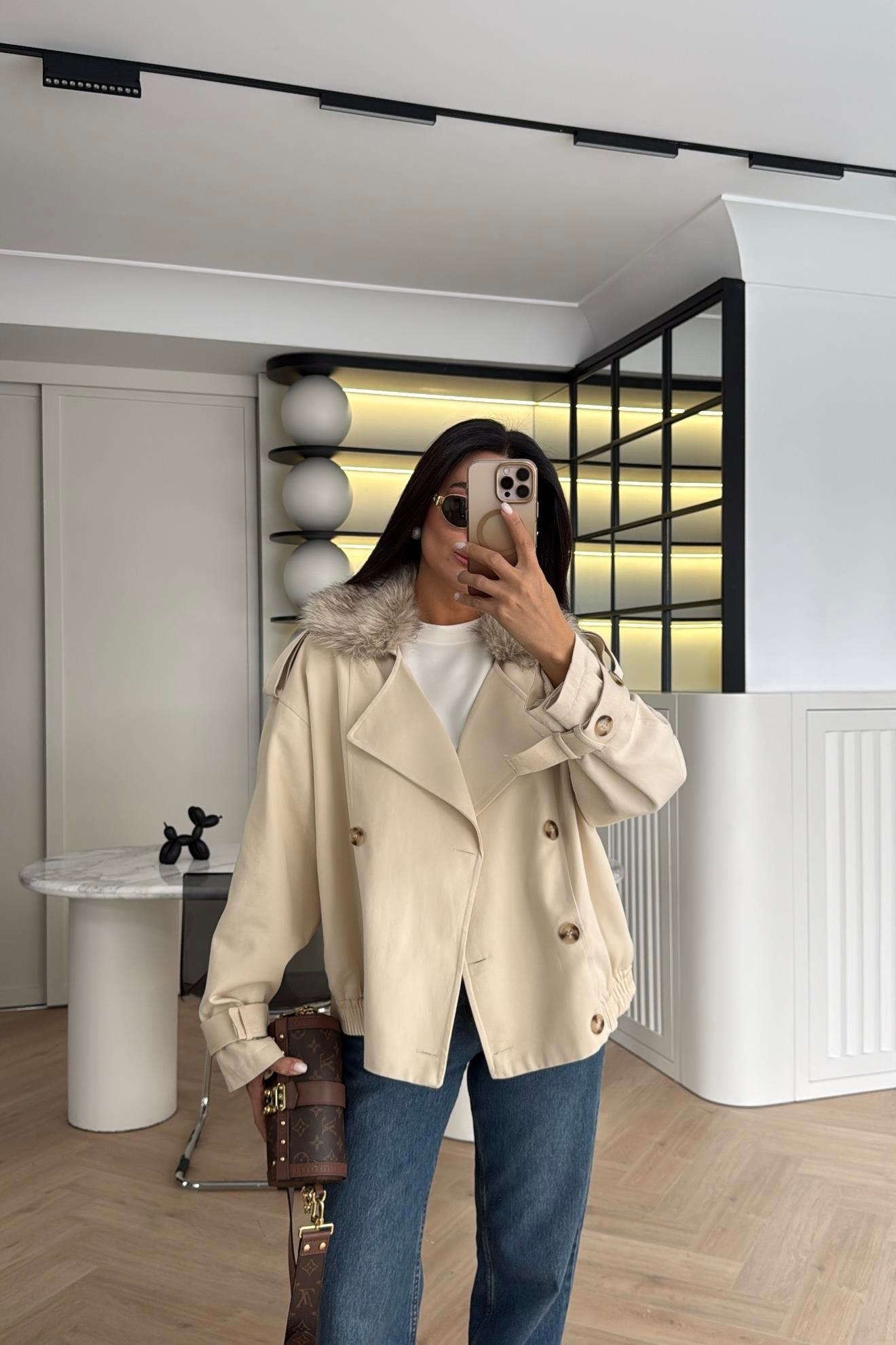 BEJ YAKASI KÜRK DETAYLI KISA TRENÇKOT