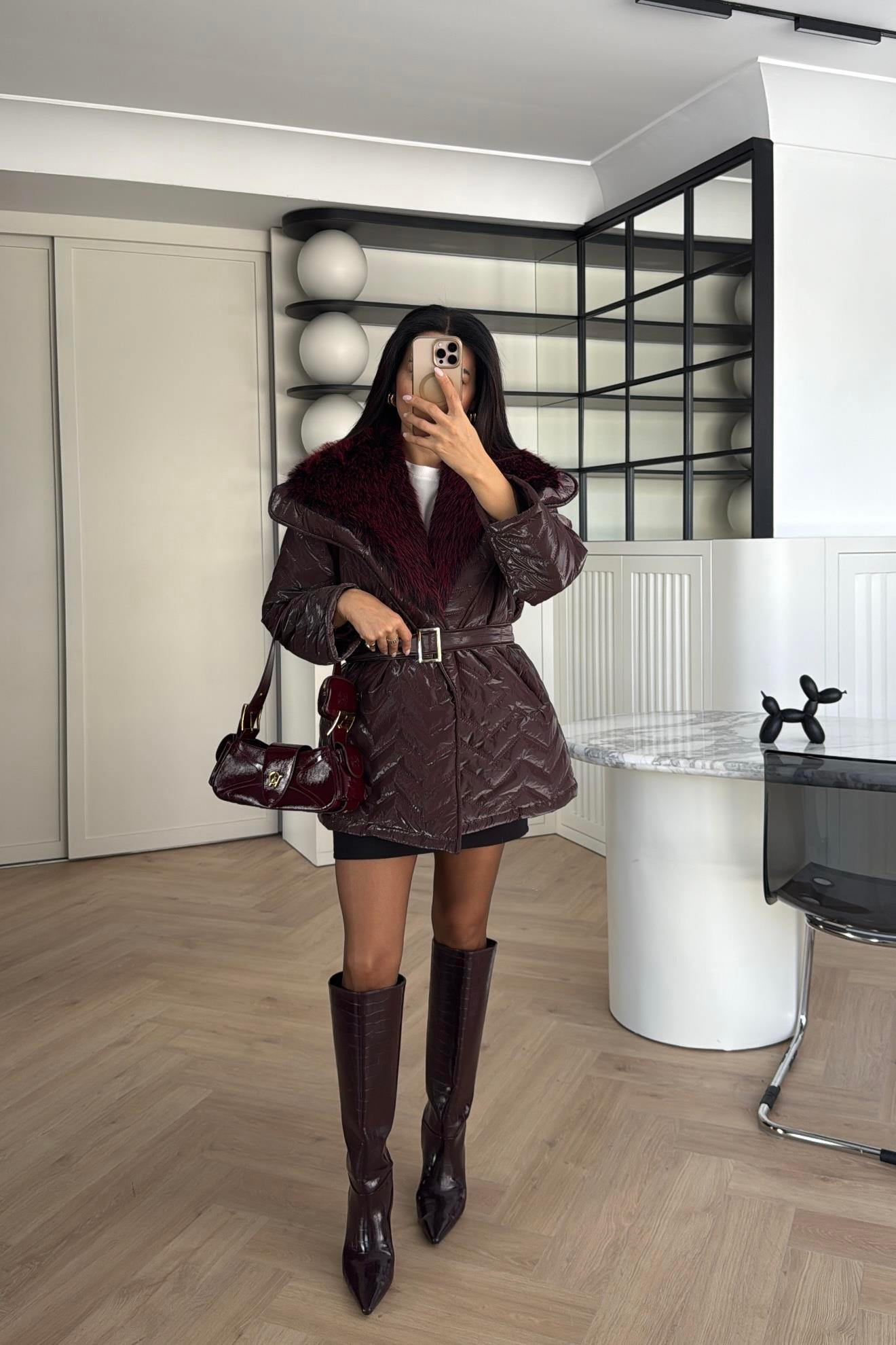 BORDO RENK TASARIM KÜRKLÜ ELYAF DOLGULU MONT