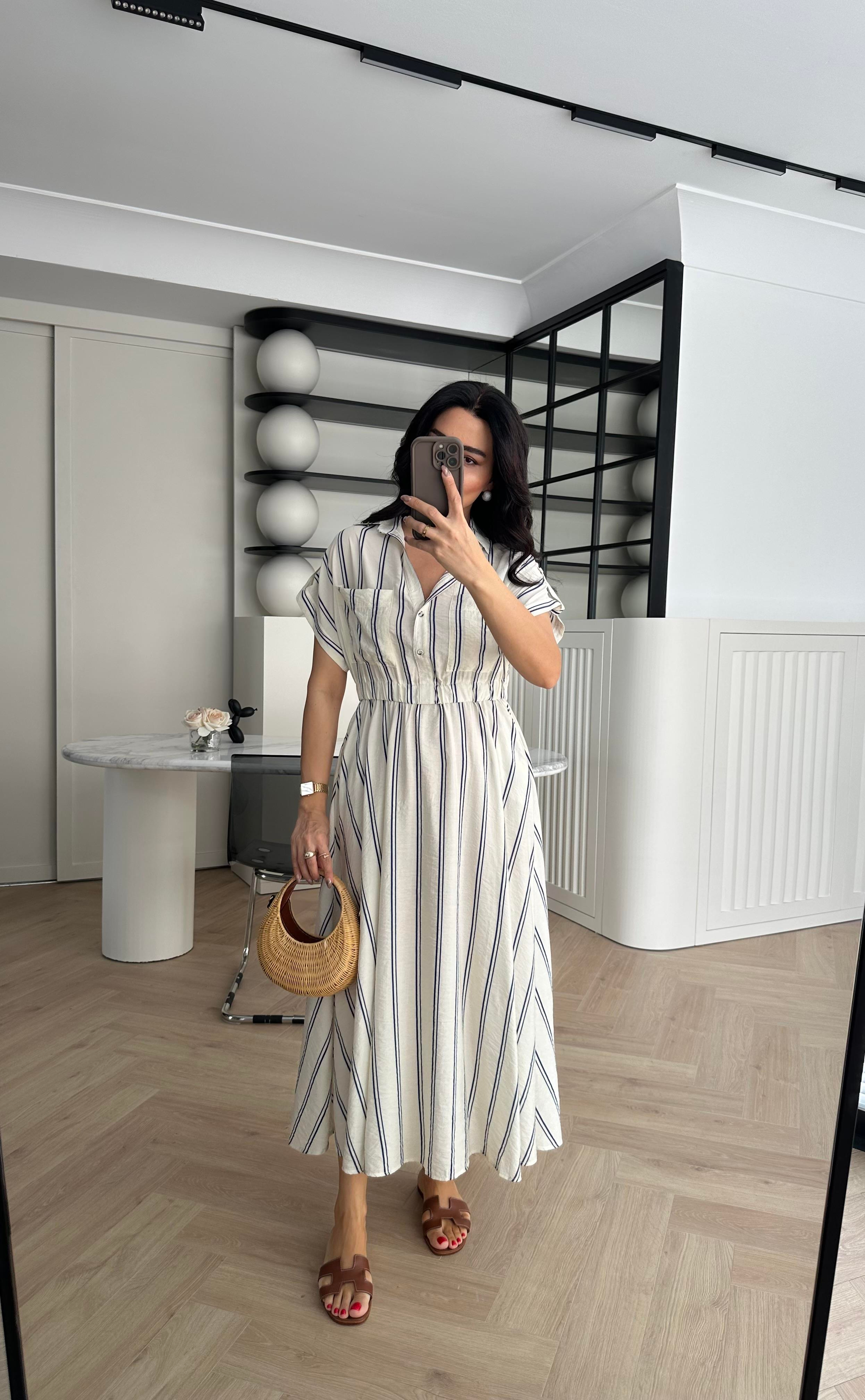 Ekru Çizgili Beli Lastikli Tensel Elbise