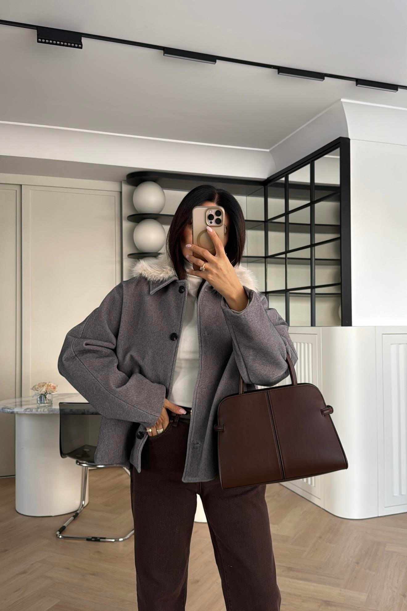 GRİ RENK ZR MODEL YAKASI KÜRKLÜ KAŞE CEKET