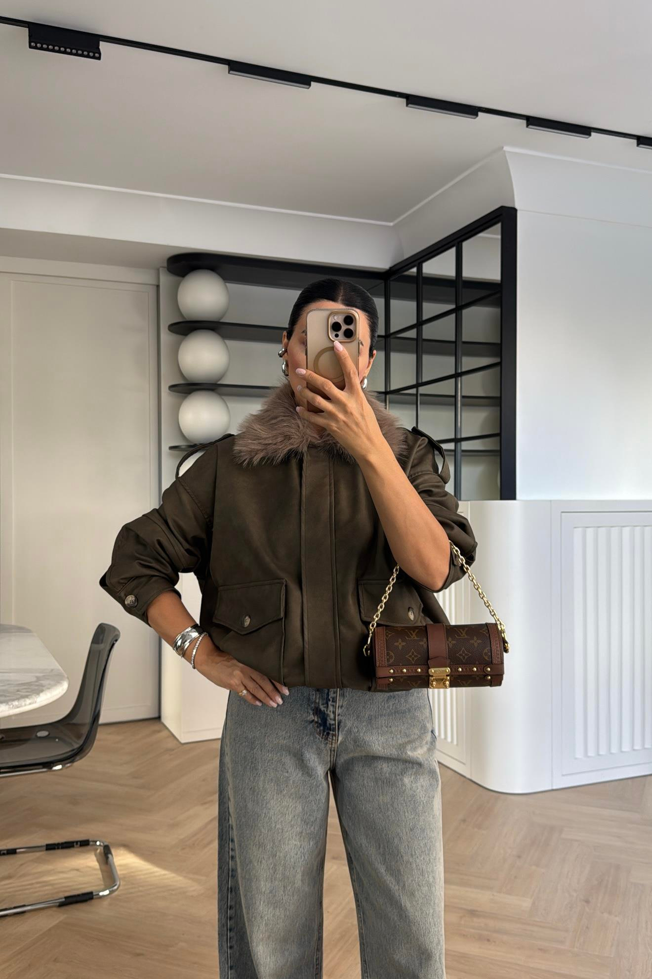 HAKİ YAKASI KÜRKLÜ ZR MODEL DERİ CEKET