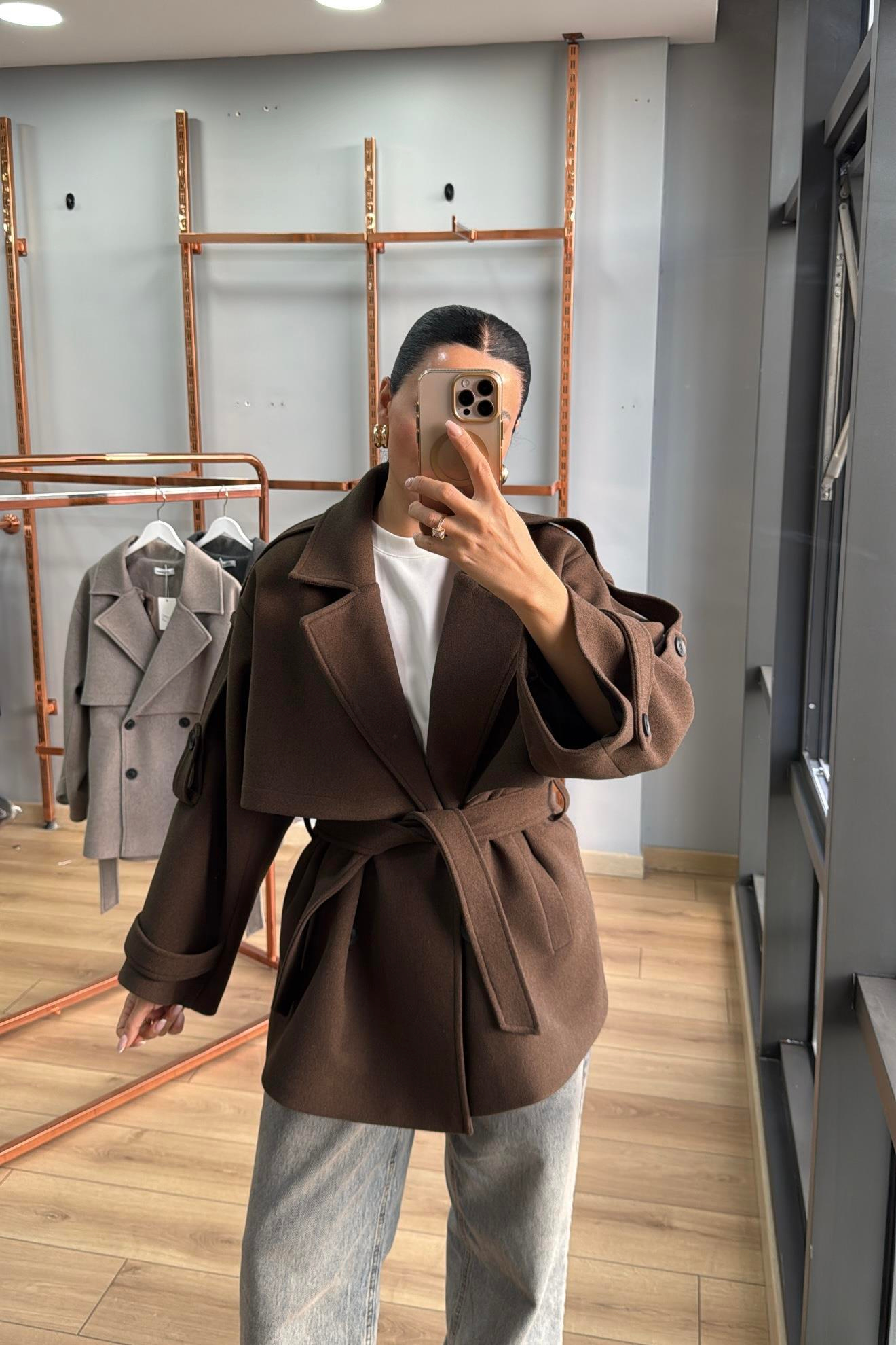 KAHVE ARKASI RÜZGARLIKLI KUŞAKLI PREMİUM KAŞE KABAN
