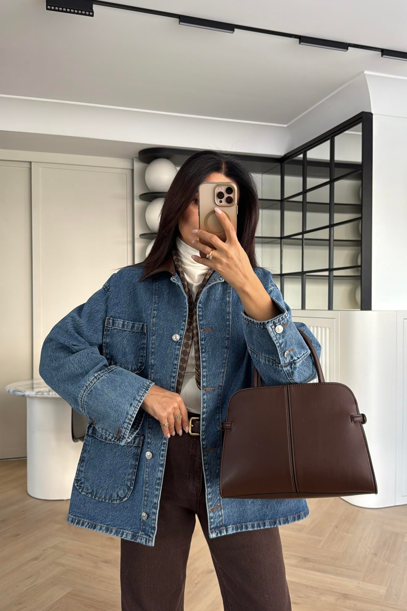 KAHVE DERİ YAKA DETAY DENİM CEKET