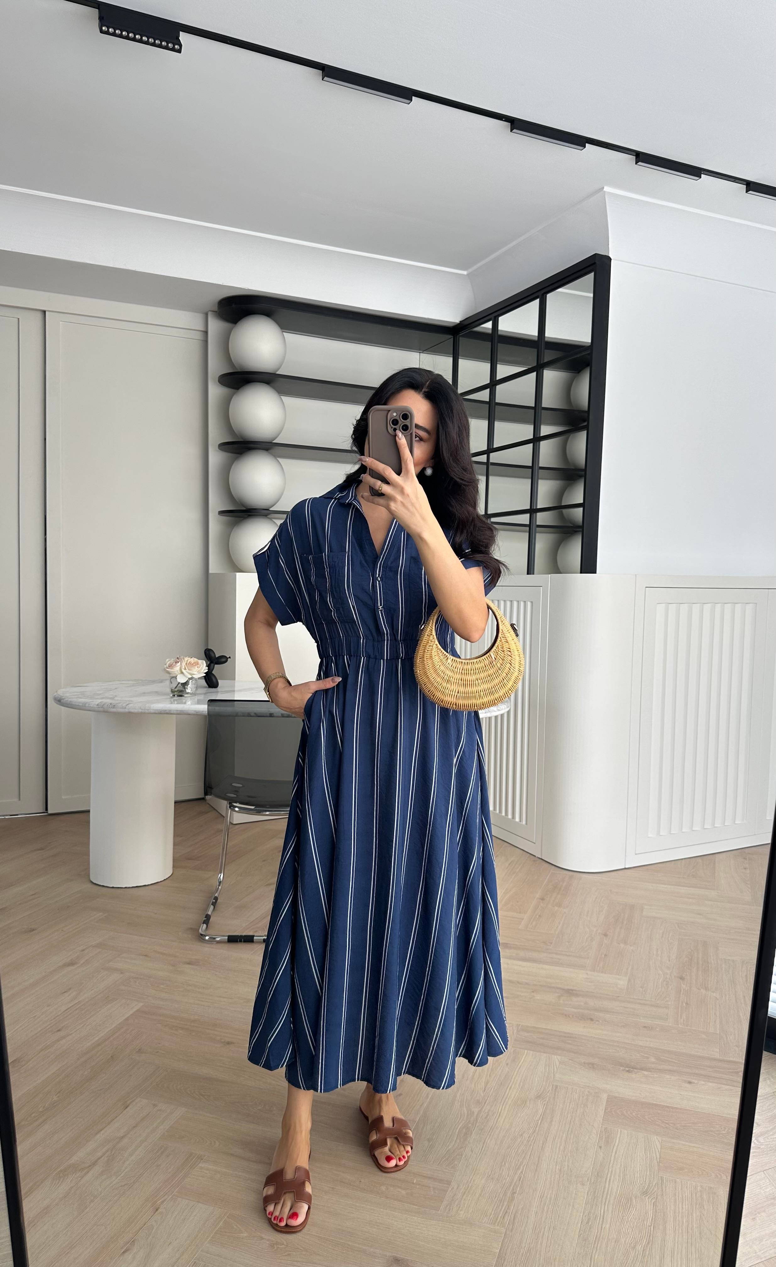Laci Çizgili Bel Kısmı Lastikli Tensel Elbise