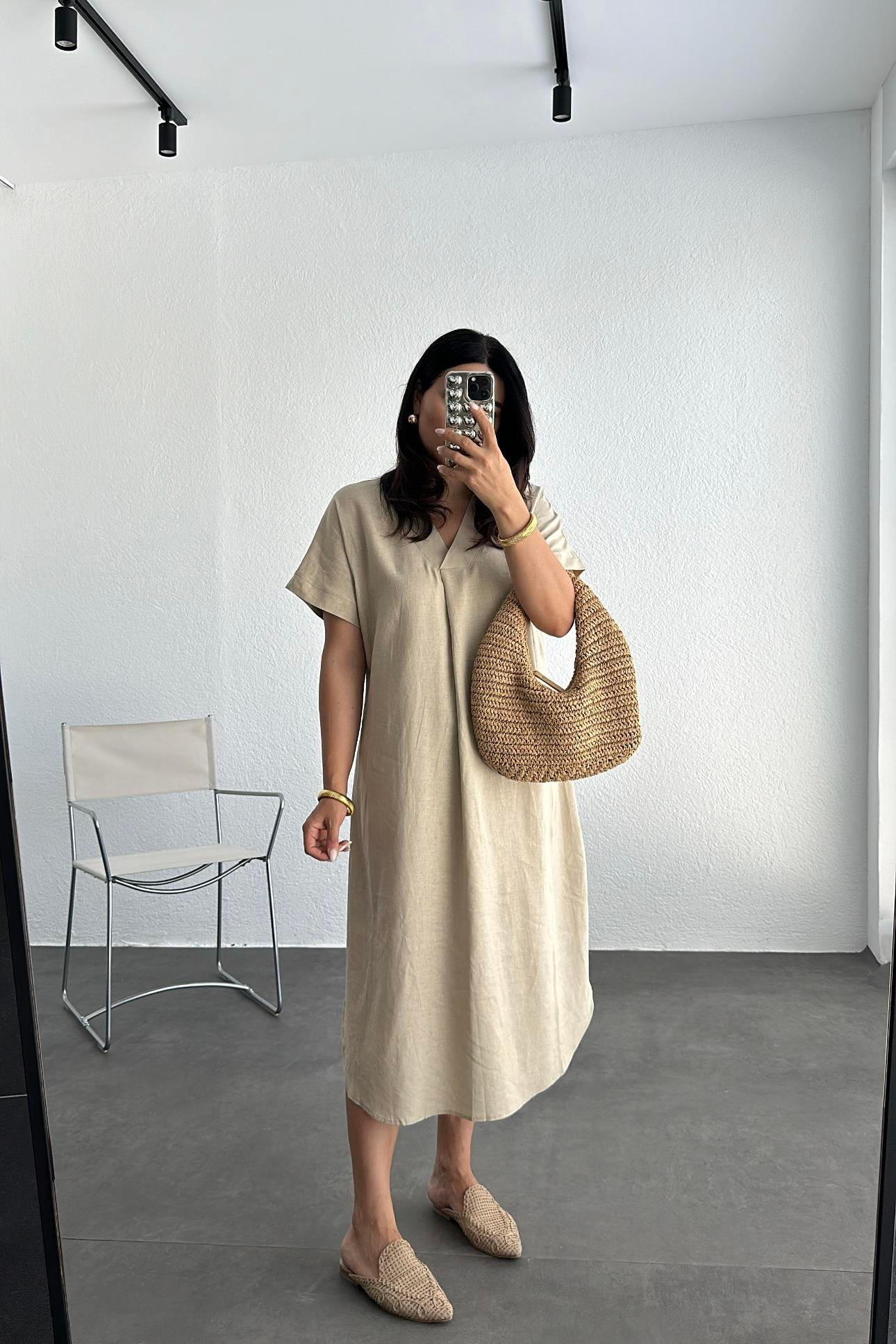 Naturel Renk Rahat Kalıp Keten Elbise