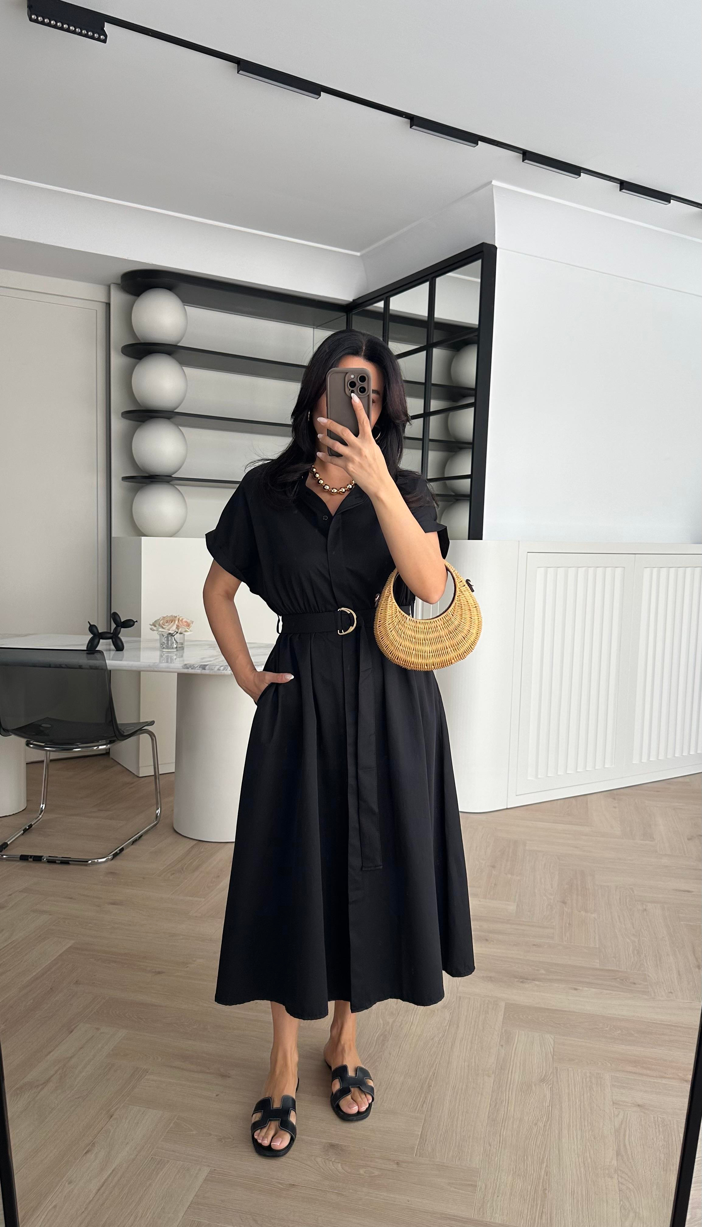 Siyah Cep Detaylı Kemerli Gömlek Elbise