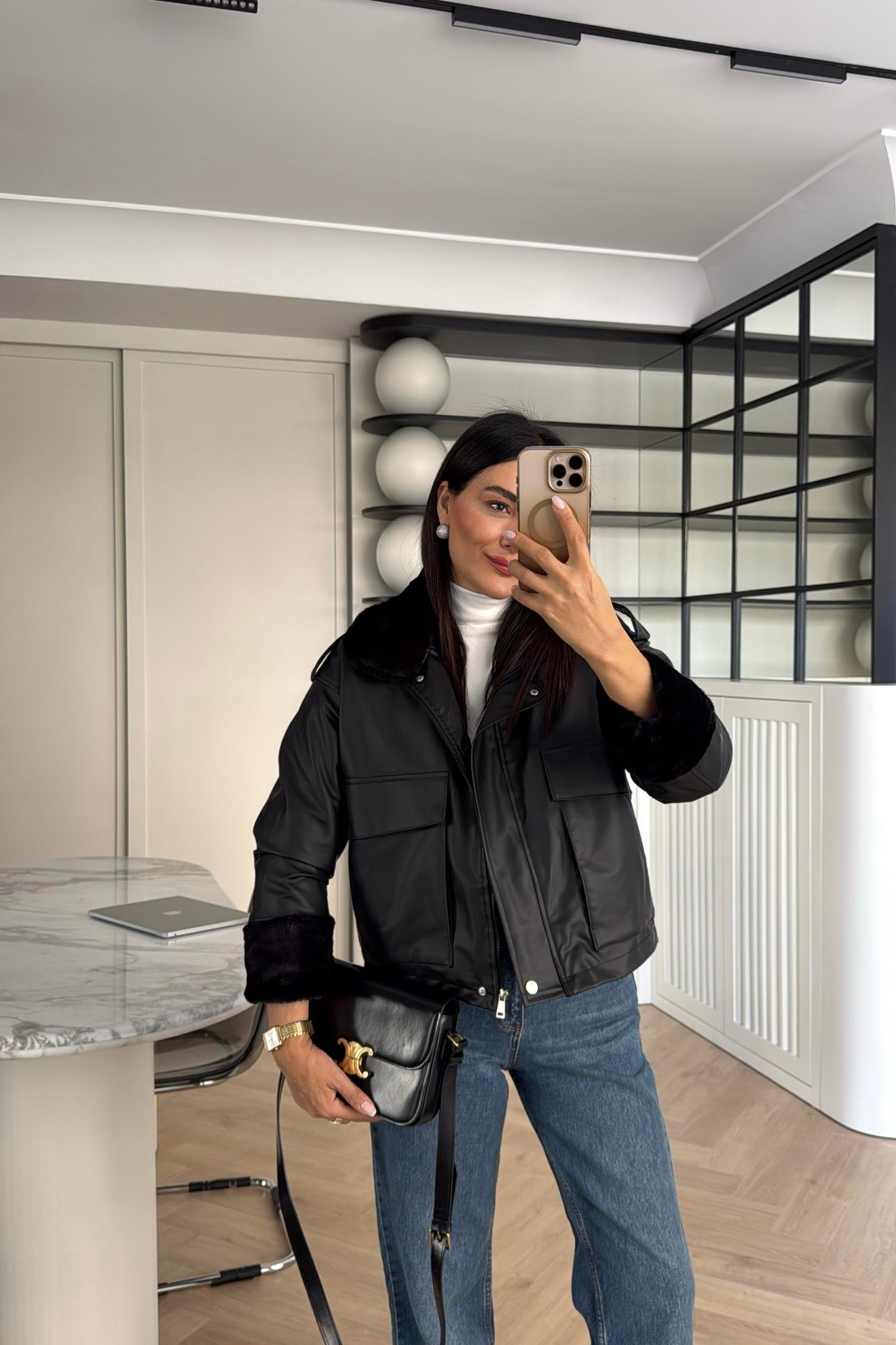 SİYAH İÇİ VE YAKASI KÜRKLÜ CEP DETAYLI DERİ CEKET