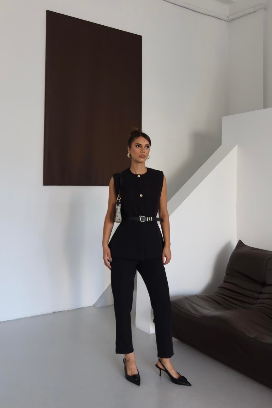 SİYAH KEMERLİ YELEK PANTOLON TAKIM
