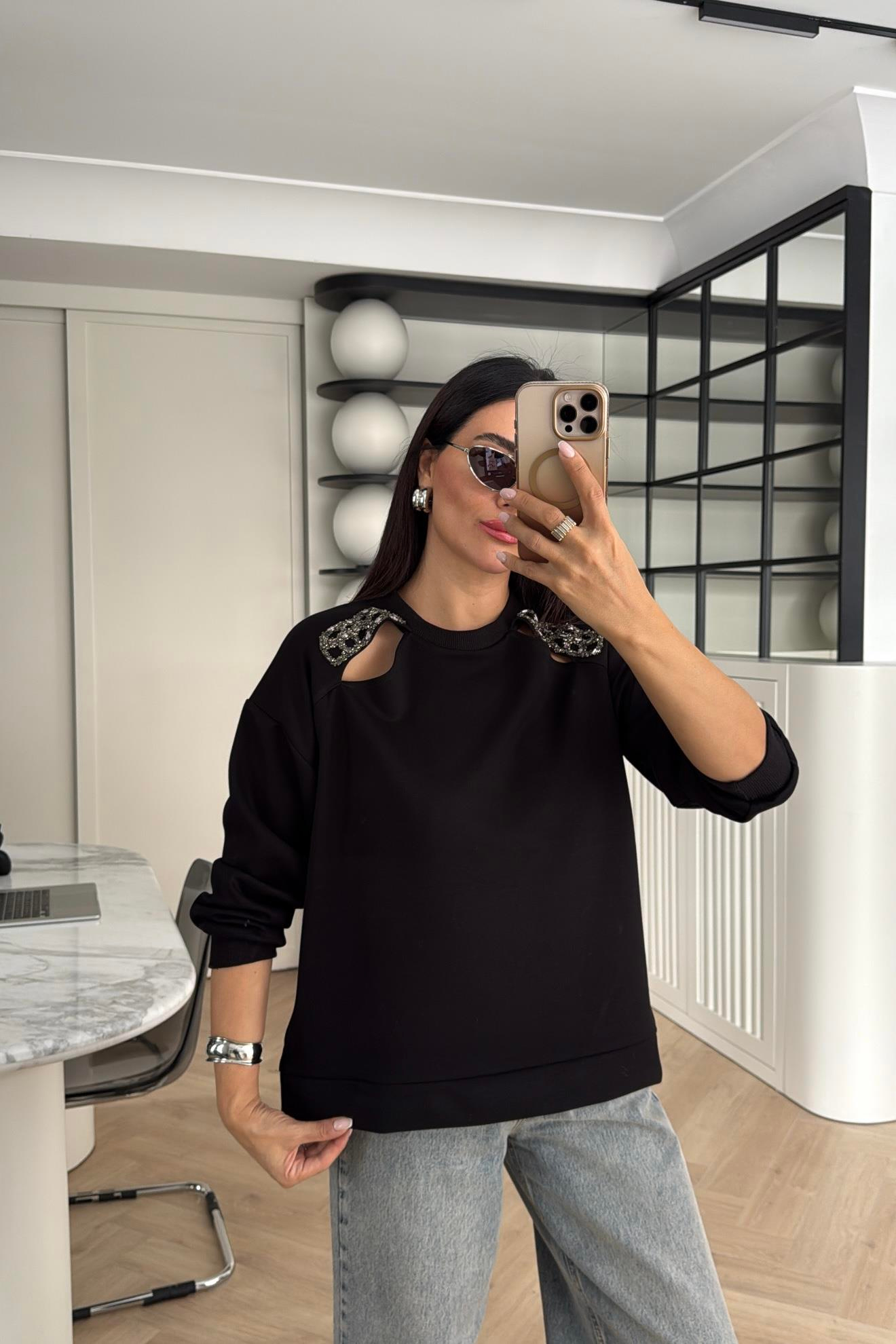 SİYAH OMZU TAŞ DETAYLI SWEATSHİRT